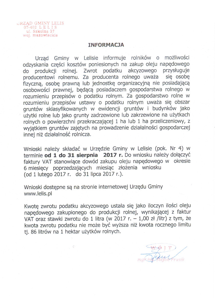 Urząd Gminy w Lelisie informuje rolników o możliwości odzyskania części kosztów poniesionych na zakup oleju napędowego do produkcji rolnej. Zwrot podatku akcyzowego przysługuje producentowi rolnemu. Za producenta rolnego uważa się osobę fizyczną, osobę prawną lub jednostkę organizacyjną nie posiadającą osobowości prawnej, będącą posiadaczem gospodarstwa rolnego w rozumieniu przepisów o podatku rolnym. Za gospodarstwo rolne w rozumieniu przepisów ustawy o podatku rolnym uważa się obszar gruntów sklasyfikowanych w ewidencji gruntów i budynków jako użytki rolne lub jako grunty zadrzewione lub zakrzewione na użytkach rolnych o powierzchni przekraczającej 1 ha lub 1 ha przeliczeniowy, z wyjątkiem gruntów zajętych na prowadzenie działalności gospodarczej innej niż działalność rolnicza.